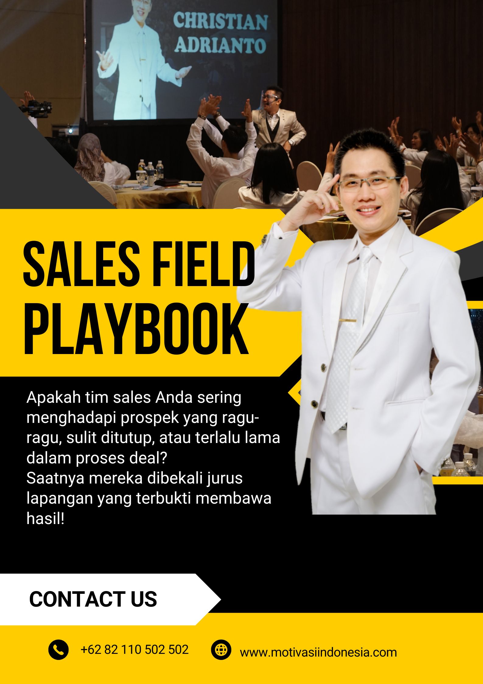 Christian Adrianto dipercaya oleh perusahaan besar seperti: BCA, BRI, BNI, Mandiri, Prudential, Allianz, Pertamina, Astra International, Honda, dan ratusan lainnya. Hasilnya nyata: penjualan naik, semangat tim kembali, dan target bisa tercapai bahkan di saat sulit. Dengan rekor peningkatan penjualan hingga 4.000%